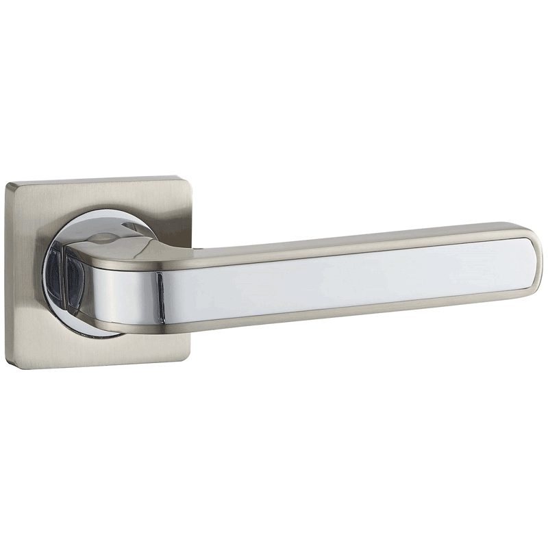 Ручка дверная на квадратной розетке, предназначена для установки на межкомнатные и входные двери. Матовый никель, вставка хром блестящий. |