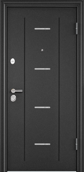 Полотно толщиной 74 мм, усиленное металлическими элементами, холоднокатаная сталь 1,2 мм в полотне двери. ,Замковая система класса «стандарт+»